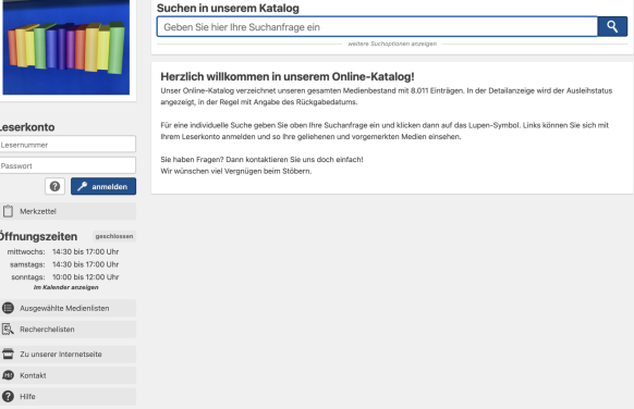 Sie können sich in der Bücherei anmelden und den Katalog zur Vorbestellung und Verlängerung von Medien nutzen.