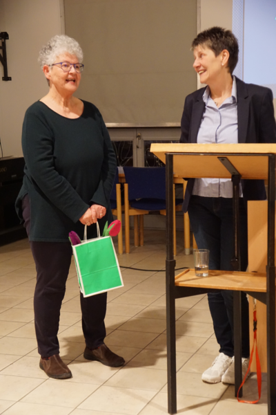 Büchereileiterin Angelika Haimerl bedankte sich im Namen der Büchereimitarbeiterinnen bei Frau Schlecht für ihr großes Engagement, mit dem sie die Vorlesestunden gestaltet hat und überreichte einen Blumenstrauß.