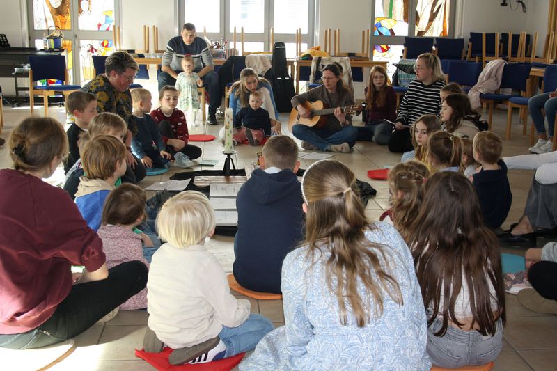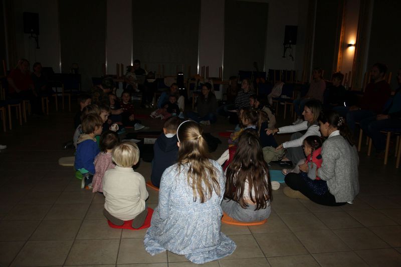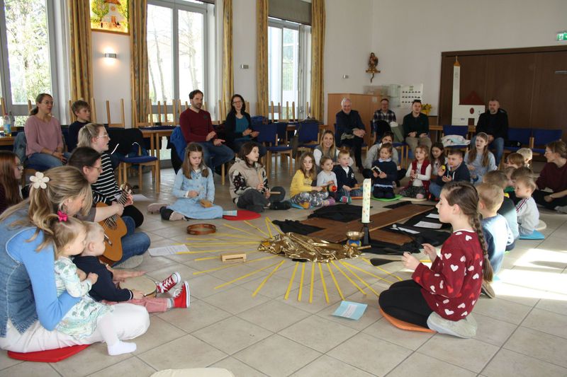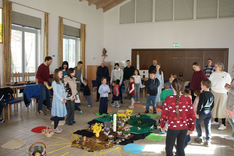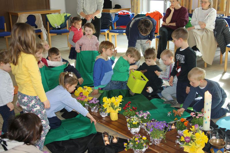 Zu Ostern feierten auch die Kleinen einen Kindergottesdienst im Pfarrheim. Zu Beginn war der Raum völlig abgedunkelt - so dunkel, wie das Grab Jesu. Doch mit der Auferstehung kam Licht hinein und aus dem harten Holzkreuz wurde mit Hilfe fleißiger Helfer ein blühendes und vor Leben strotzendes Paradies.