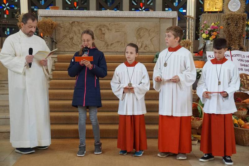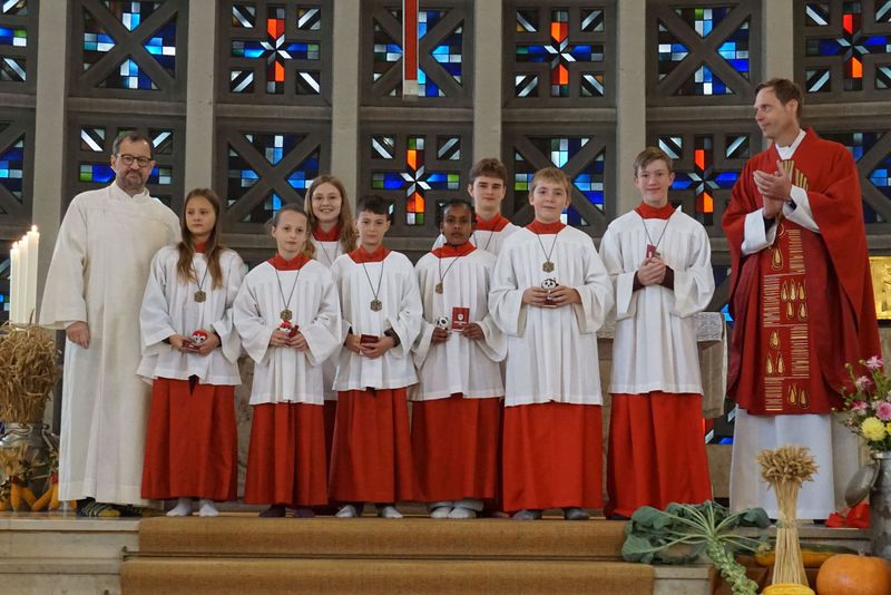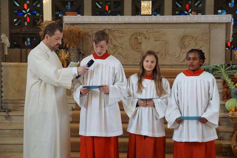 Zum Erntedankfest werden in St. Josef jedes Jahr die neuen Ministranten aufgenommen. Heuer sind 3 Mädchen und 3 Jungen der Ministrantengruppe beigetreten. Der Gottesdienst stand unter dem Motto "Warum tun wir es nicht?". Diesen absolvierten alle Minis und auch der liturgische Dienst zunächst nur in Socken. Aber weil die Minis nicht nur davon reden, sondern sich tatsächlich in der Pfarrei engagieren, durften sie nach der Aufnahme auch ihre Schuhe wieder anziehen.