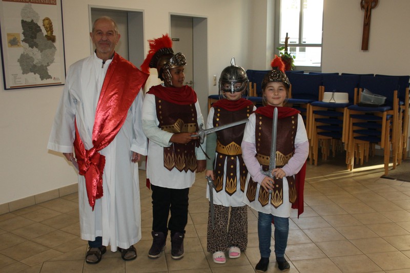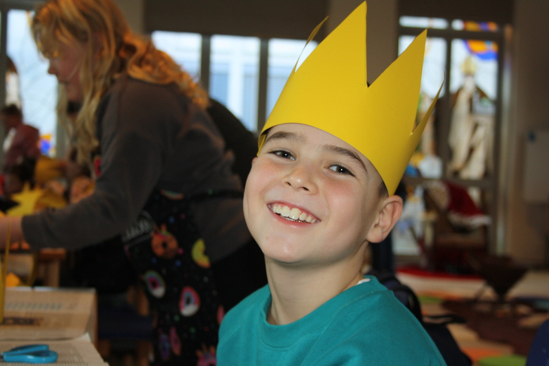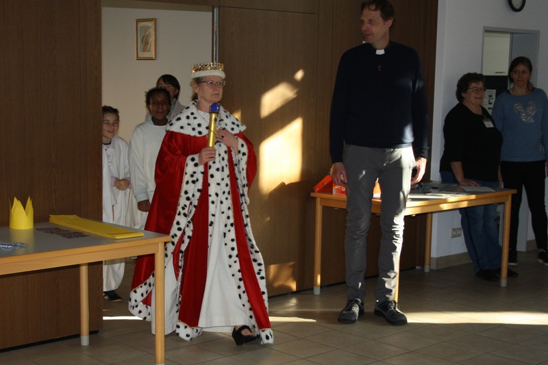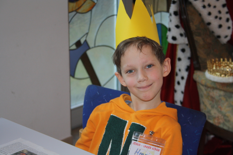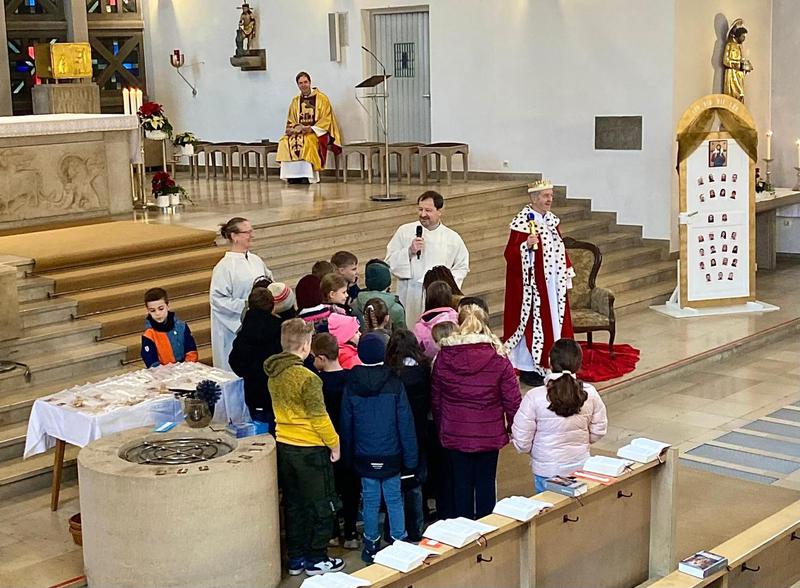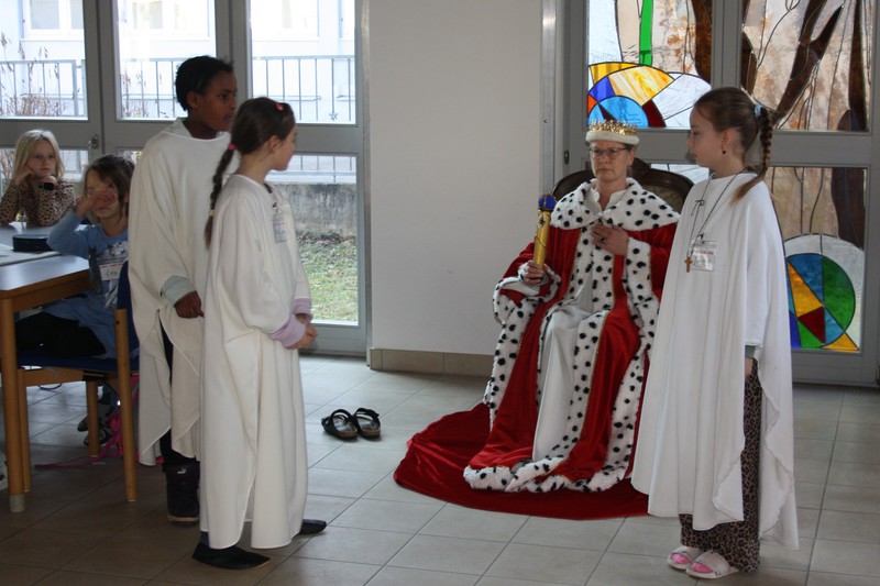 Am Christkönigs-Wochenende trat zunächst ein „klassischer König“ auf mit goldener Krone, Königsmantel und Zepter und setzte sich, von Dienern begleitet, auf seinen Thron. Im Gespräch wurde den Kindern dann vermittelt, dass auch Jesus ein König ist – aber ganz anders als die Könige, die wir uns sonst vorstellen.