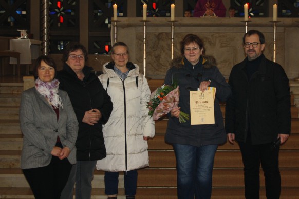 Theologin und Religionslehrerin i.R. Angelika Haimerl wurde für ihr großes Engagement als Leiterin der Pfarrbücherei geehrt, aber auch für ihre vielfältigen Aufgaben als Seelsorgerin, im Pfarrgemeinderat und beim Meditativen Tanz.
